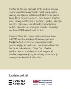 Vizuelni identitet osmomartovskih marševa od 2016. godine oblikuje likovna umjetnica Tanja Markuš, kroz kontinuirani autorski proces koji prati društvenu i političku dinamiku borbe za prava žena u Crnoj Gori.