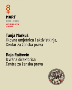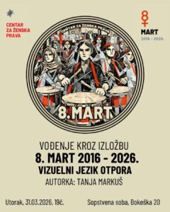 Pozivamo vas na vođenje kroz izložbu „8. Mart 2016-2026: Vizuelni jezik otpora”, posvećenu jubileju obnove Osmomartovskog marša, koji je 2016. godine ponovo uspostavljen kao prostor javnog okupljanja, solidarnosti i borbe za prava žena.